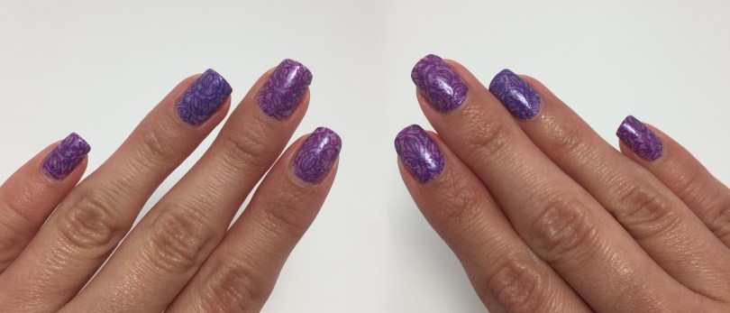 And guess which design I finally decided on? The hardest one: stamping over the same image. I used Bundle Monster – Bam! White as the first stamp, and it went on great. (I added Poli-Peel before doing anything) Luckily, I thought ahead. Since the double stamping didn’t work so great on the mat, I decided to only do two nails at first. Unfortunately, it didn’t work on my nails either. I even put the stamp in the opposite direction on my ring finger. So, I just decided to scrap that idea and go with one simple stamp in purple.