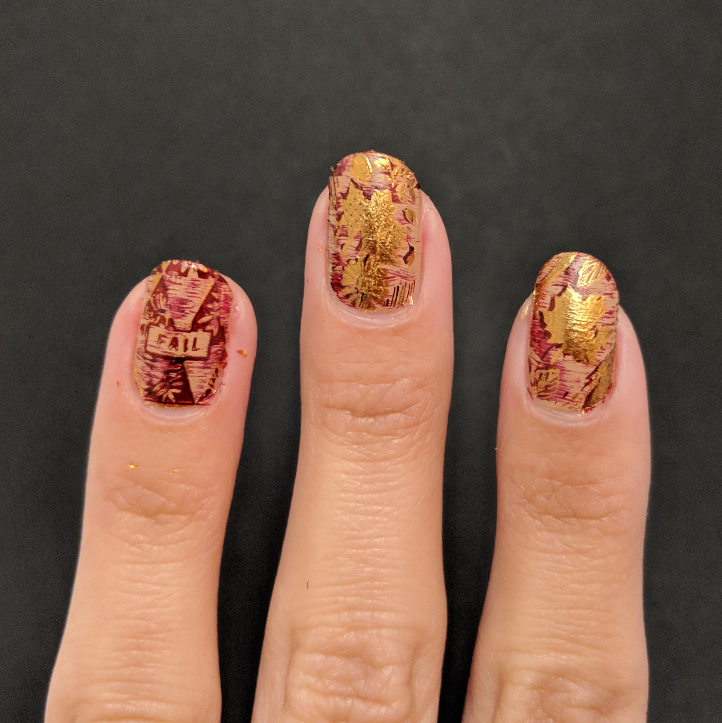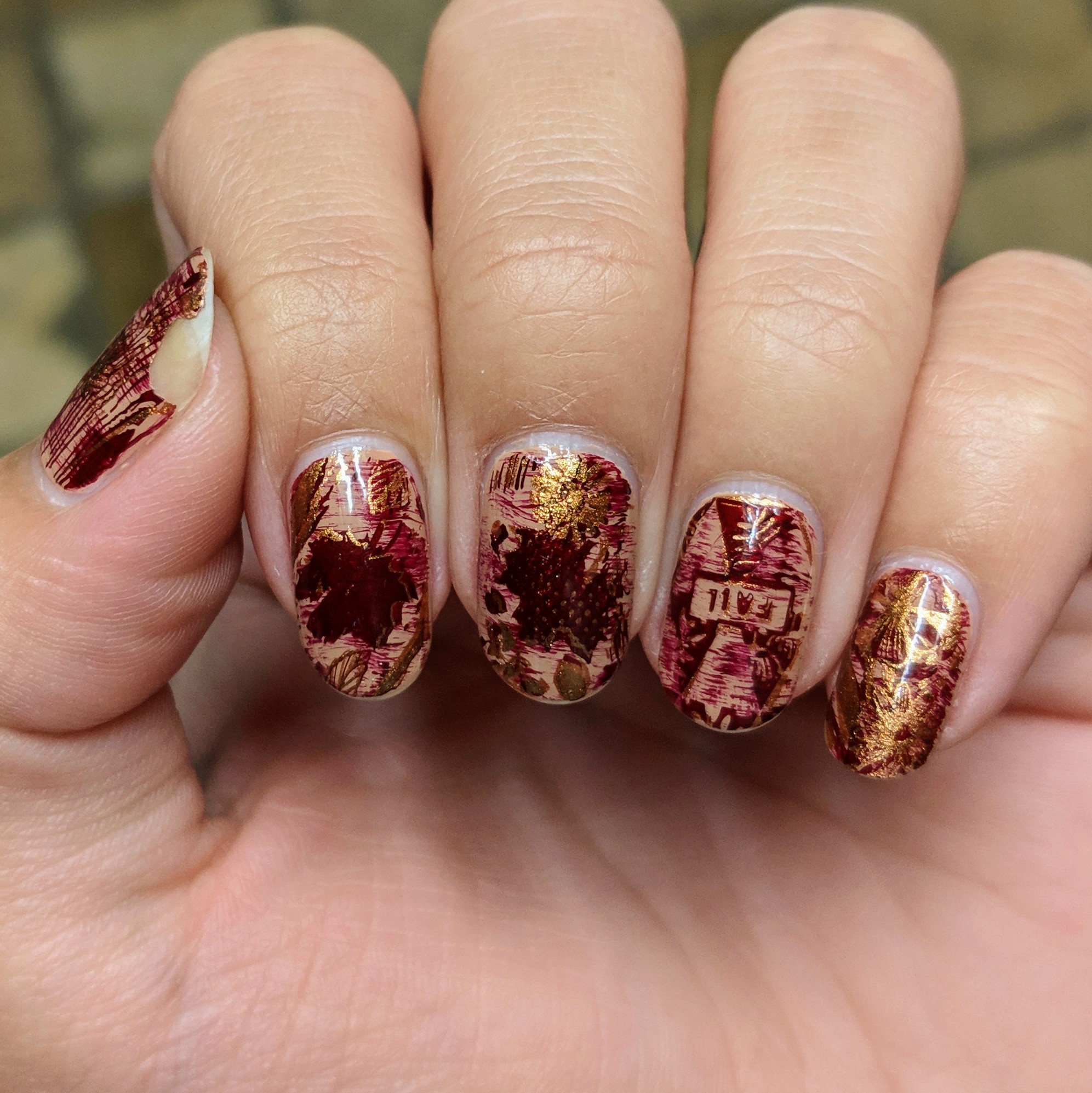 So after letting those nails dry, and removing the liquid latex, I stamped over everything in gold.  My ring finger was the only nail that needed to be stamped in red before doing gold again.  But that is when I realized that I liked it better with the gold on bottom and red on top.  And instead of redoing all of my other nails, I chose to leave a different “accent” nail.  And to tie them all together, I added another layer of stamping.  But this final layer was to stamp the large leaves one more time, in red.
