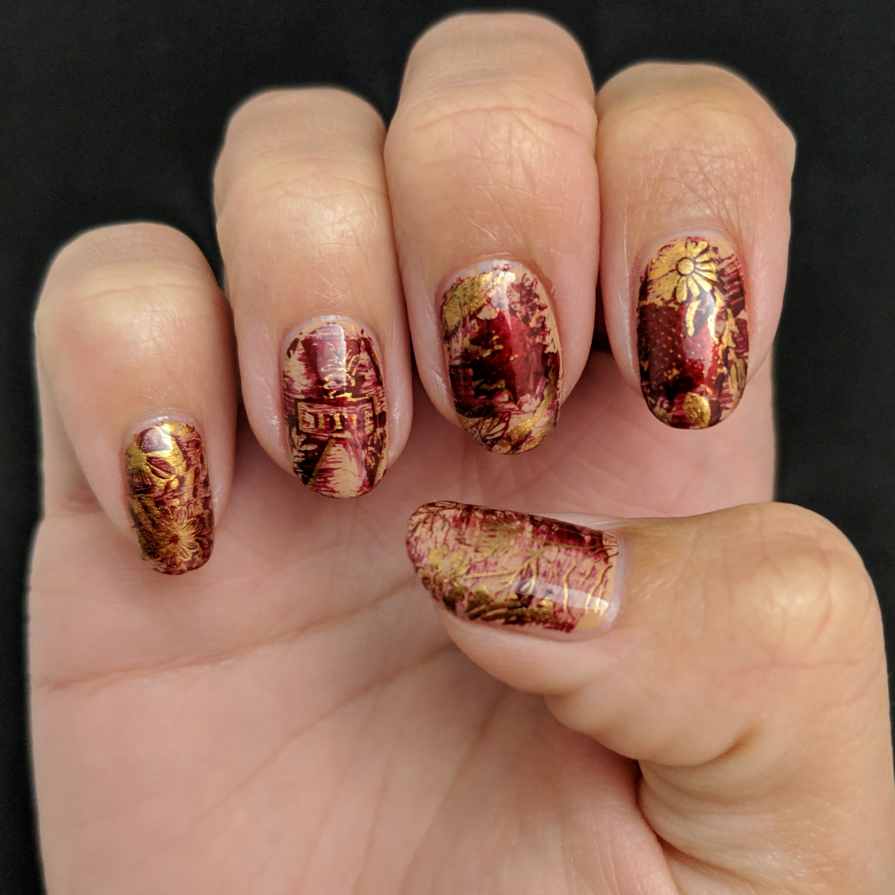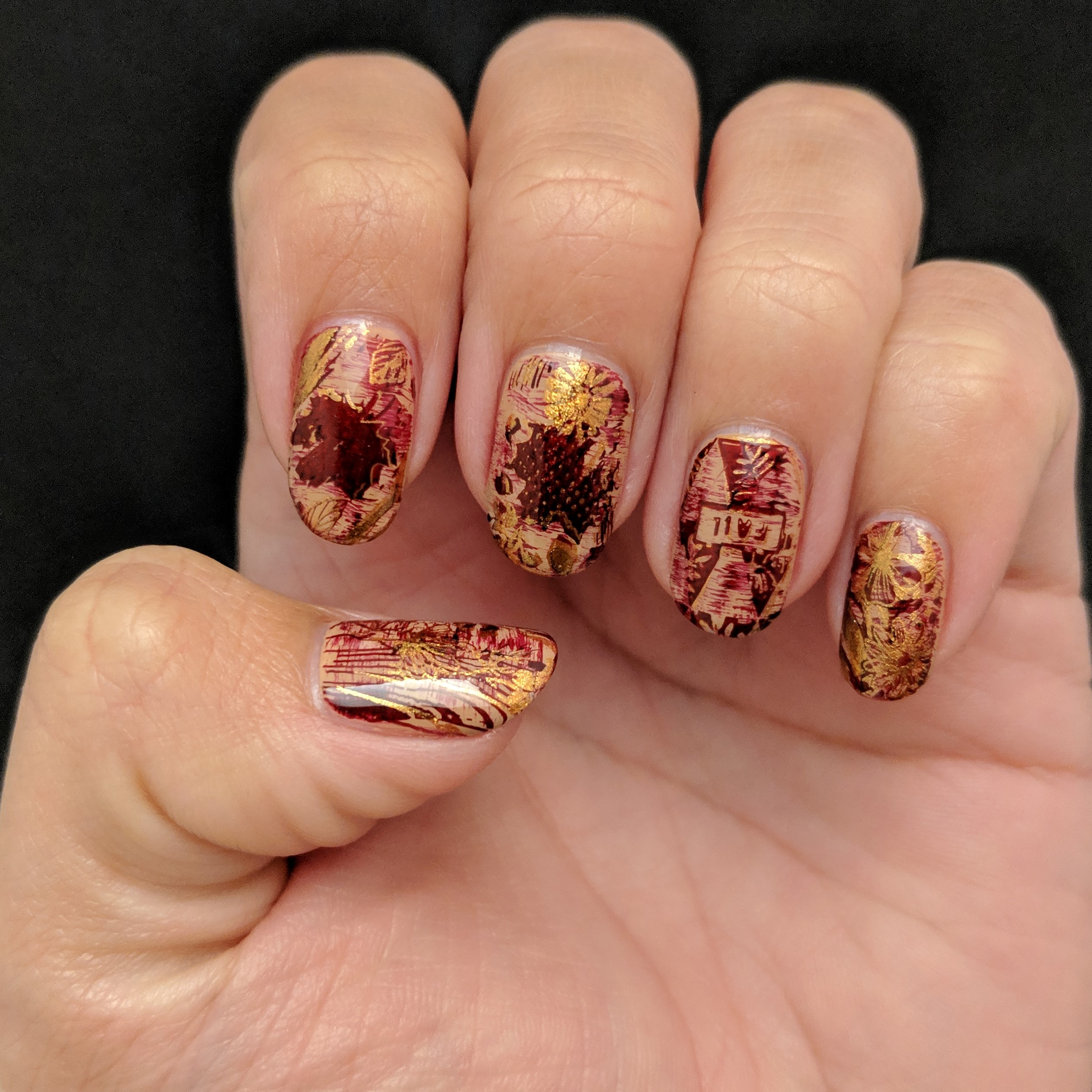 The stamping was last, and I expected it to be quick and easy.  But, of course, life doesn’t always give you what you want.  I tried stamping the gold on my ring finger first, but it was hard to see it.  Even with the red dry brush, the gold just wasn’t popping.  So I immediately changed it up and stamped the rest of my nails in red.  But the new problem was that the red blended in to the dry brush in the background.